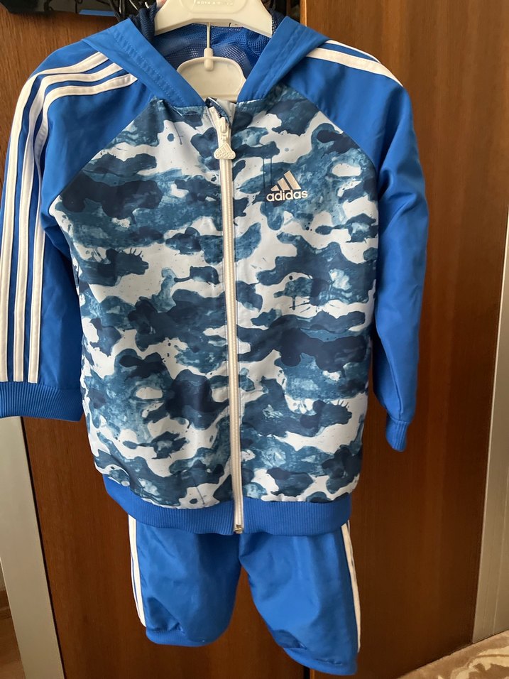 Erkek çocuklar için dar kesim, kapüşonlu fermuarlı, koyu mavi kamuflaj desenli yumuşak kumaştan eşofman takımı. Adidas markalı, sokak stili için uygundur.