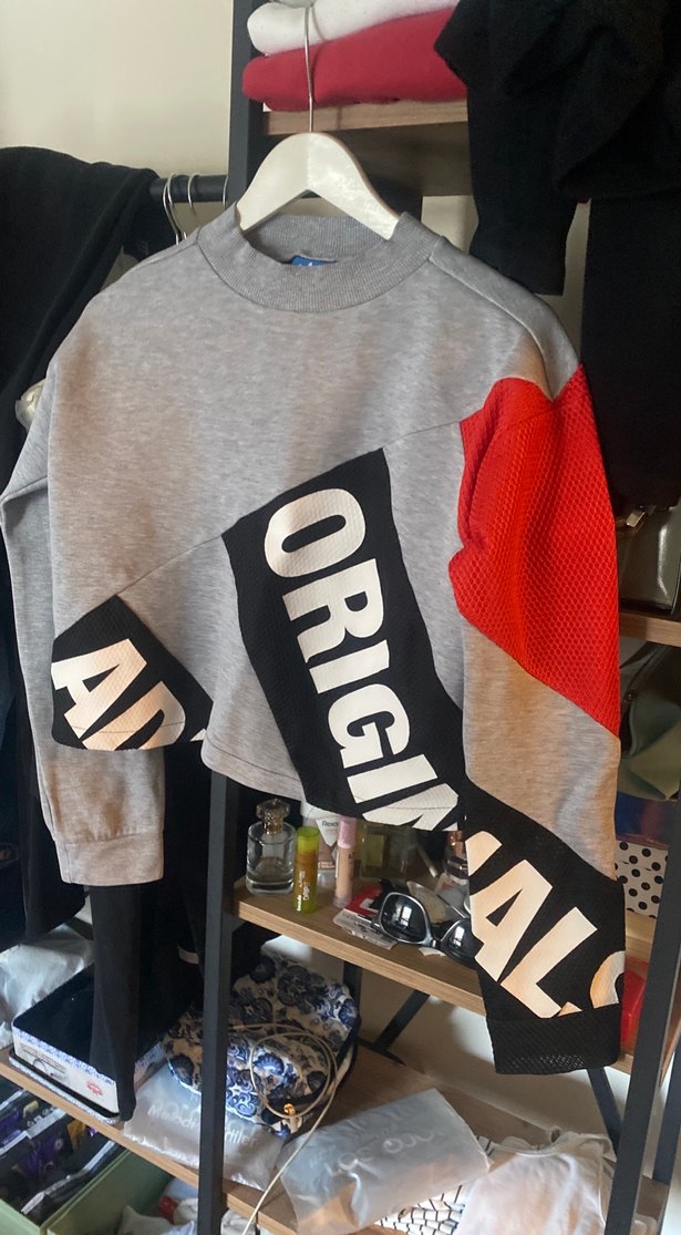 Baskılı yazılı ve kolunda velcro detayı bulunan bol kesim gri sweatshirt. Uzun kollu, yuvarlak yakalı ve tekstil kumaştan yapılmıştır. Günlük kullanım için uygundur. Özel seri Adidas Orjinal sıfır ayarında sorunsuz tertemiz durumda