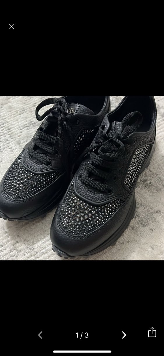 Siyah renkli, parlak taş detaylı yılan desenli kadın spor ayakkabısı. Yüksek topuklu ve kauçuk tabanlı, günlük kullanıma uygun goth tarzında.marka temsilidir
