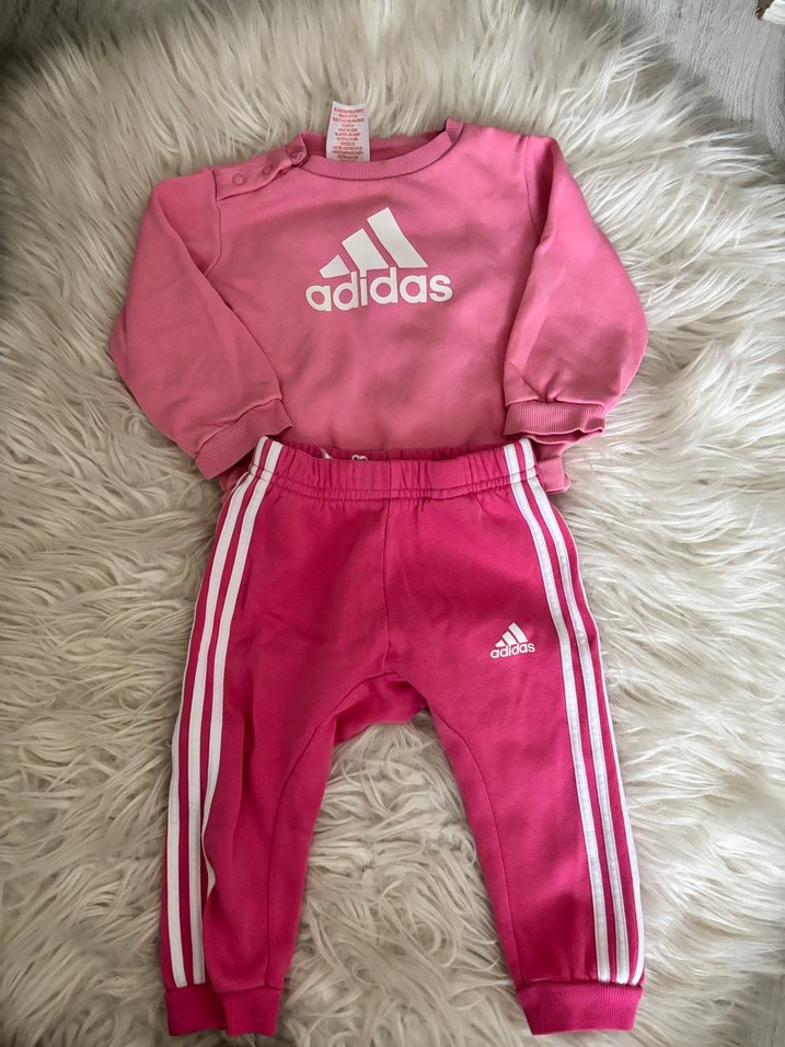 Adidas marka, bol kesim, uzun kollu, yumuşak kumaşlı pembe kız çocuk eşofman takımı. Üstte velcro düğmeler ve baskılı logo vardır. Beyaz şerit detaylıdır. Küçük lekesi vardır fotoğraf ekledim