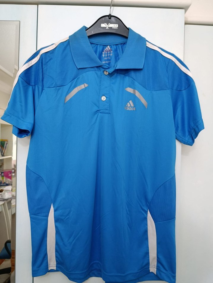 Erkekler için mavi, parlak sentetik kumaştan yapılmış, yakalı ve kısa kollu, düğmeli, baskılı detaylara sahip, sportif ve şık kesim polo tişört.
