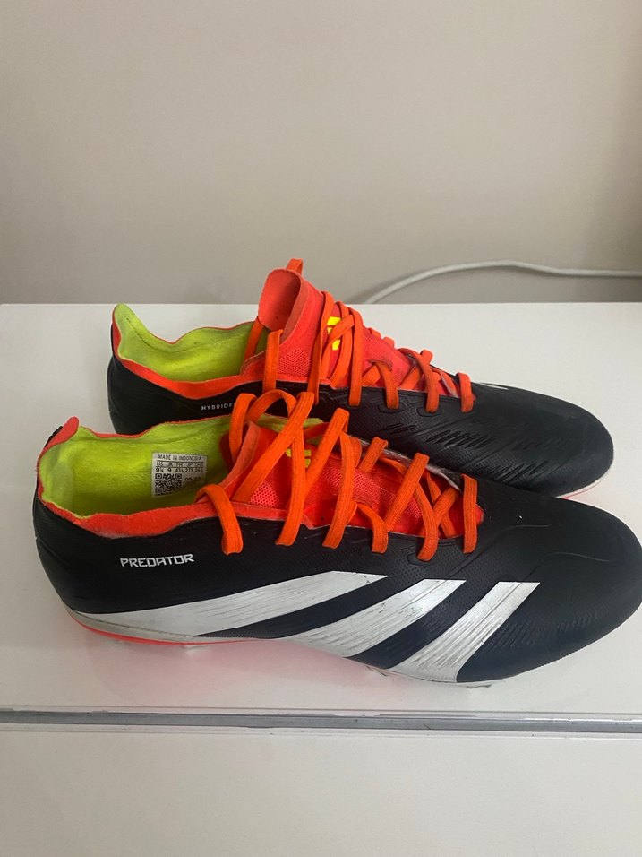Erkek futbol ayakkabısı, canlı turuncu bağcıklar ve koyu çok renkli tasarımla modern bir görünüme sahip. Kauçuk taban ve cırt cırtlı detay içerir. ⚽