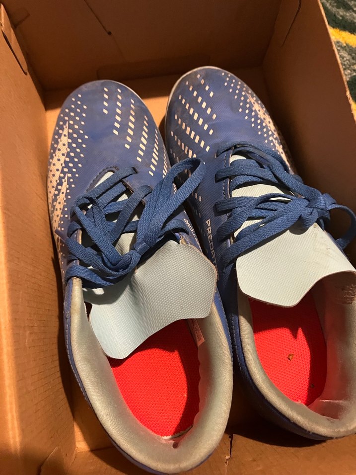 Mavi renkte, kauçuk tabanlı ve Adidas Predator bağcıklı erkek futbol ayakkabısı. Spor ve sokak tarzı için uygun, desensiz ve gri detaylara sahip. ⚽