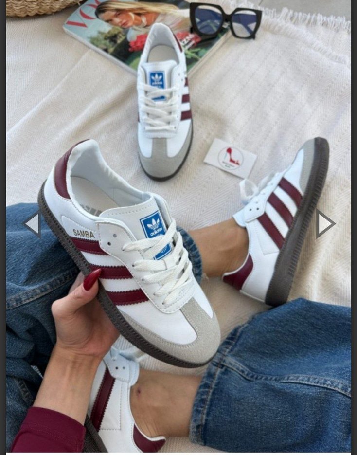 Beyaz bordo samba .Tam kalıp .Cilt kumaş .Mavi Adidas baskılı kutu .İç Adidas baskılı fusped .Bagcik bağlı .ön burun nubuk kumaş darbelere Dayanıklı