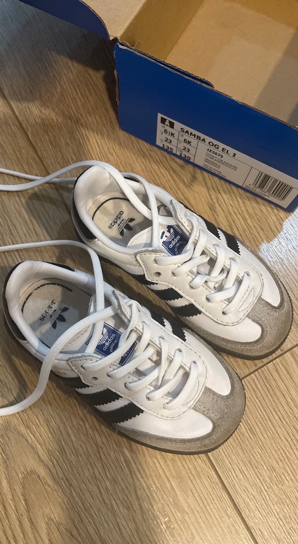 Adidas samba zemin üzerine siyah çizgili, lastik tabanlı çocuk spor ayakkabısı. Orjinal ürün superstep satıcısından alındı. Ufak tefek her günlük ayakkabıda olduğu gibi giyimi etkilemeyecek deformeler mevcut fotoğraflarda gösterdim. Bebeğim büyüdükçe yeni numarasını aldığım çok rahat kullanışlı adidasın en güzel bebek ayakkabısıdır.