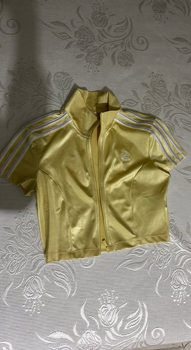 Parlak sarı renkte, kısa kollu, fermuarlı, yüksek yakalı, dar kesim kadın ceket. Spor şerit detaylarıyla athleisure ve streetwear tarzına uygun.