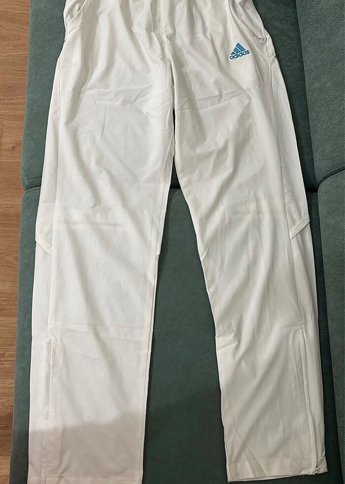 Etiketli, beyaz, ince, efil efil kumaş eşofman. Özellikle yazın giymek için harika bir seçenek.