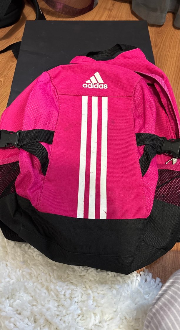 Kadınlar için pembe Adidas sırt çantası, fermuarlı bölmeler ve baskılı desen içerir. Sentetik kumaştan yapılmış, spor ve sokak tarzına uygundur.