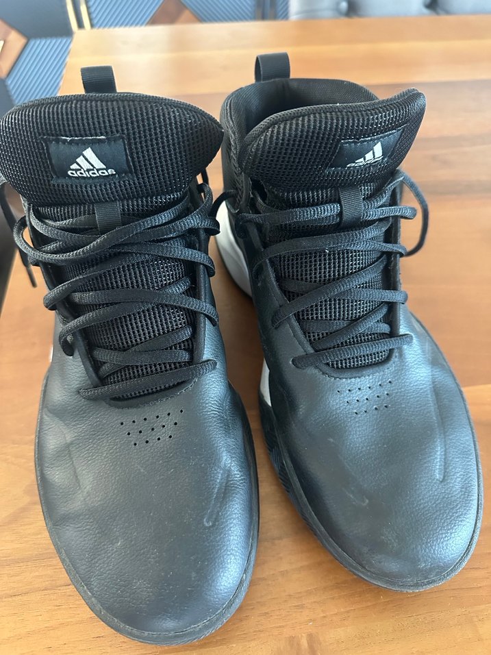 Siyah Adidas basketbol ayakkabısı, bağcıklı tasarım ve kauçuk taban ile sokak modası ve spor işlevini birleştirir. Trend belirleyiciler için avant-garde stil. 43 .5