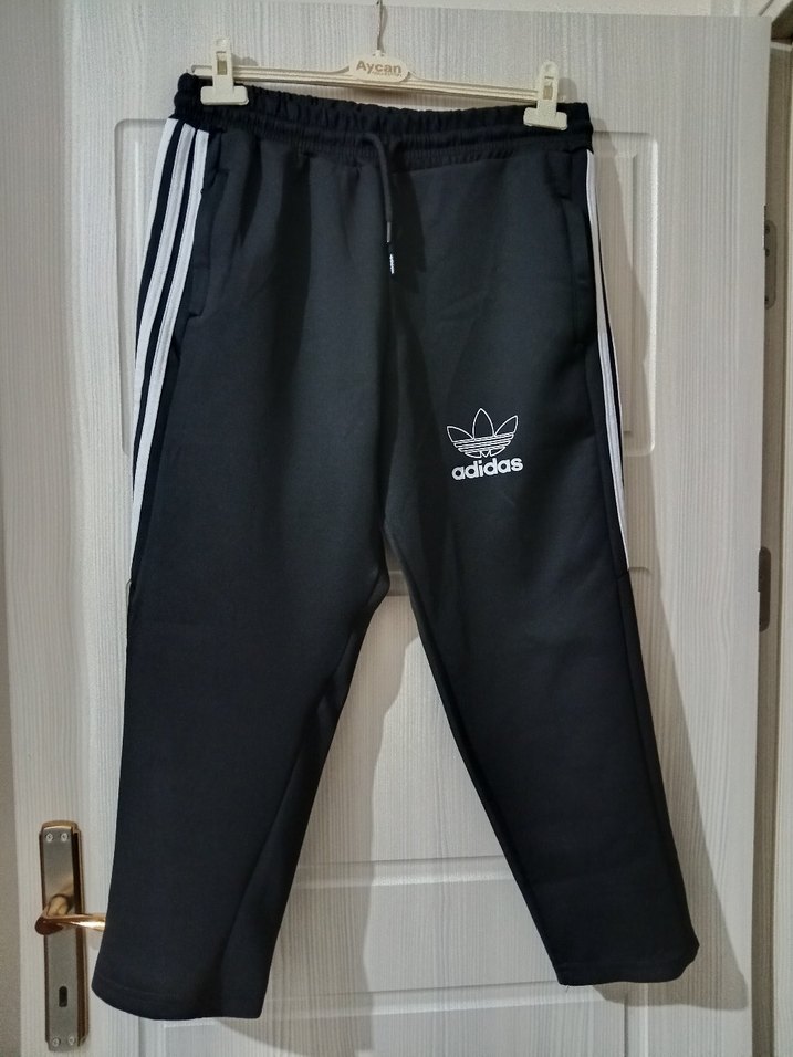 Adidas marka siyah, bağcıklı erkek eşofman altı, normal boy ve bol kesimdir. Yanlarda üç şerit ve logoya sahiptir. Spor ve günlük kullanıma uygundur. Bir bacak kısmında dikiş hatası var.Fotografta paylaştım.