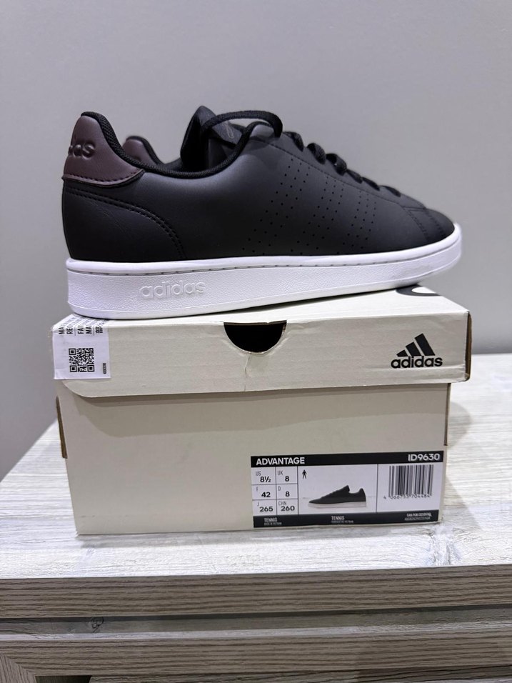 Adidas siyah baskılı kauçuk üst yüzey ve beyaz tabanlı bağcıklı spor ayakkabılar. Sokak stili ve spor rahatlığı bir arada.