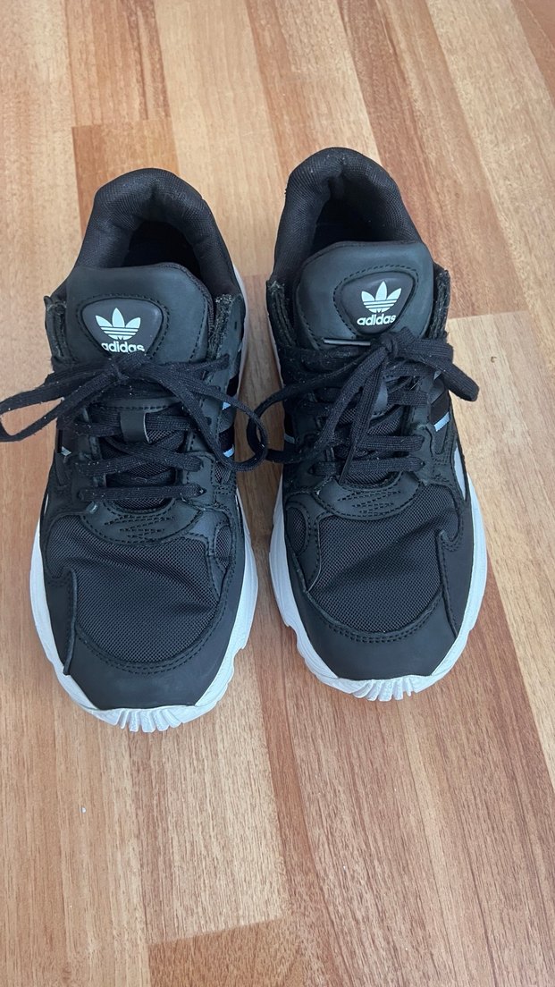 Adidas siyah bağcıklı spor ayakkabılar, stiletto topuklu ve rahat kauçuk tabanlı, sokak stili ve spor için uygun.