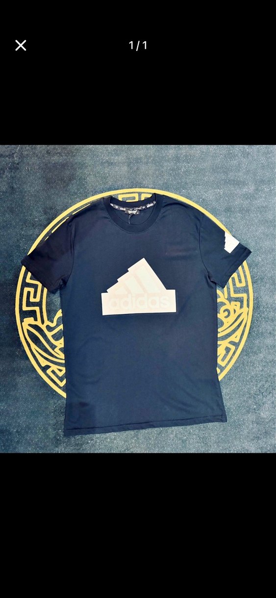 Adidas siyah baskılı tişört, kısa kollu, yuvarlak yaka ve bol kesimdir. Spor ve günlük kullanım için sentetik kumaştan üretilmiştir.