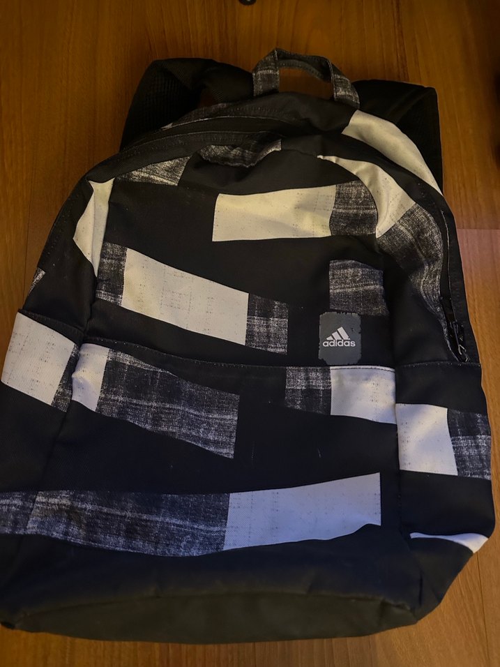 Adidas kadın sırt çantası, siyah beyaz baskılı desenli, tokalı kayışlı ve sentetik kumaştan, sokak stili ve günlük kullanım için uygundur.
