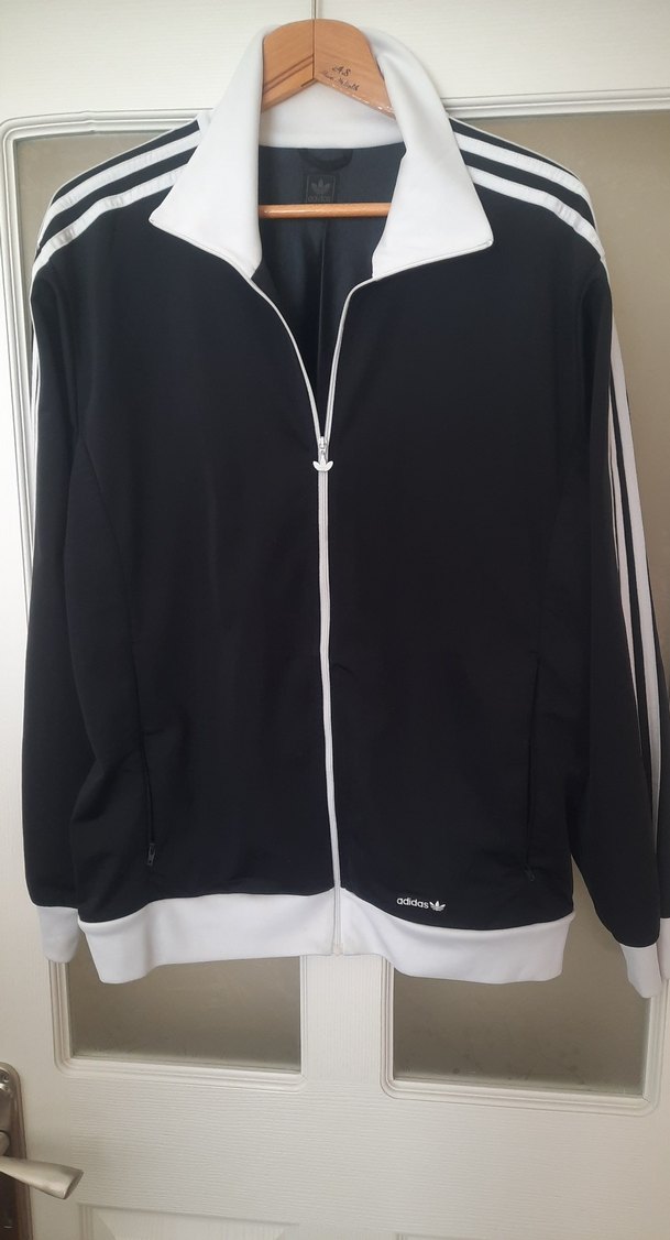 Orjinal Adidas siyah beyaz esofman takimi, uzun kollu, yüksek yakalı ve fermuarlı. Spor tarzda günlük kullanıma uygun.