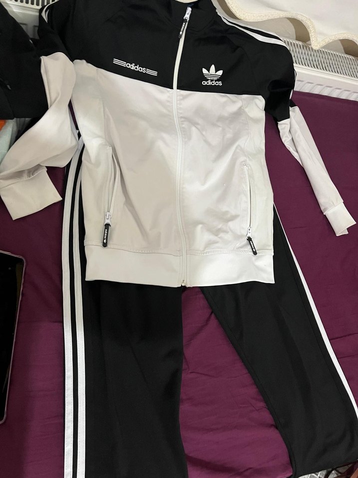 Adidas kadın eşofman takımı, fermuarlı ve uzun kollu, siyah beyaz renklerde, sokak modasına uygun ve günlük kullanıma uygundur