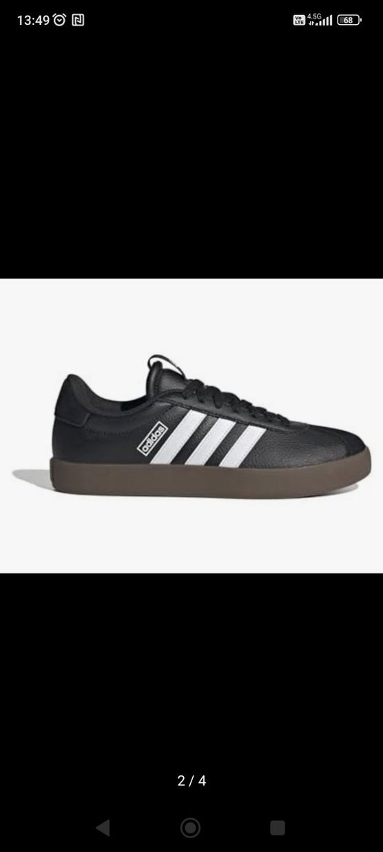 Adidas spor ayakkabısı, siyah üst kısmı, beyaz çizgileri ve kauçuk tabanıyla spor şıklığı sunar.