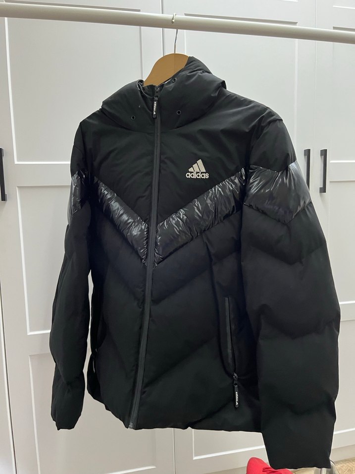 Fitted kesim, yüksek yakalı, uzun kollu Adidas siyah kışlık mont. Sentetik kumaştan, fermuarlı ceplidir. Outdoor ve streetwear için uygundur. ❄️
