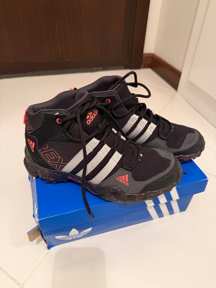 Adidas siyah baskılı erkek outdoor spor ayakkabısı,bağcıklı kapama ile. Dayanıklı kauçuk taban, sokak stili ve spor için uygun. Yepyeni hiçbir kusuru yoktur