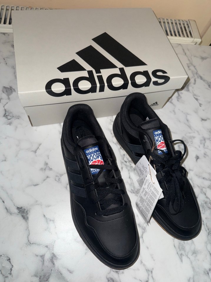 Adidas siyah erkek spor ayakkabısı, Velcro kapanışlı, kauçuk tabanlı ve baskılı detaylara sahip, sokak stili için uygun. Etiketli hiç giyilmedi.
