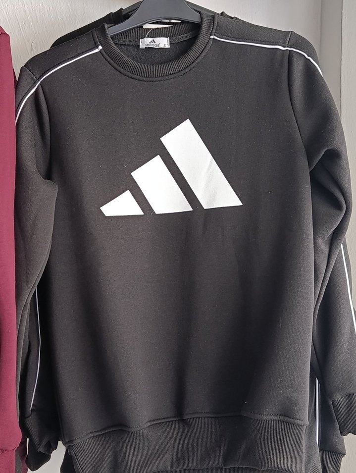 Siyah Adidas sweatshirt, yuvarlak yaka ve uzun kollu. Yumuşak fleece kumaştan, baskılı logo ve cırt cırt detaylı. Spor ve günlük kullanıma uygun.