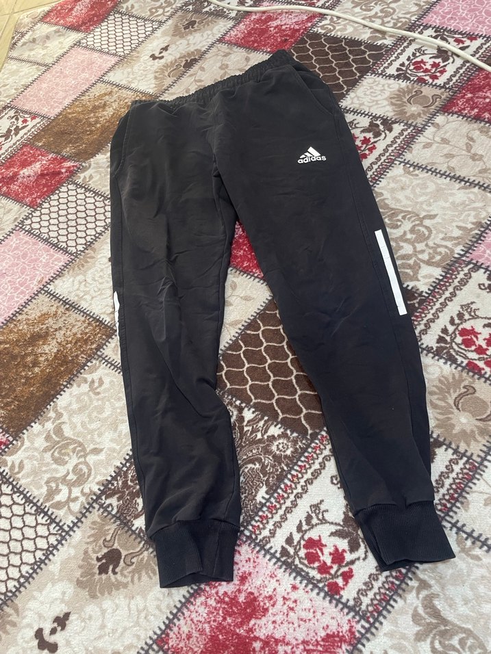 Adidas siyah renkli, fermuarlı cepleri olan, sentetik kumaştan üretilmiş, rahat bol kesim erkek outdoor eşofman pantolonu. Sokak stiline uygun.
