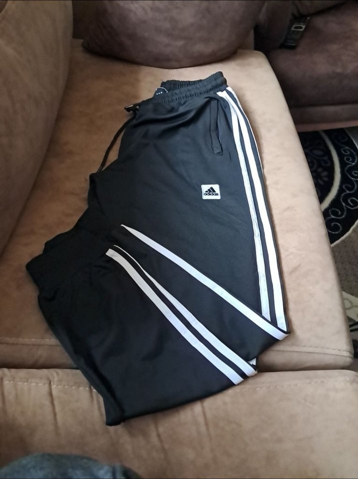 Adidas siyah, beyaz şerit detaylı, fermuarlı cepli, rahat kesim erkek eşofman altı. Spor ve günlük kullanıma uygun, orta boy uzunlukta.