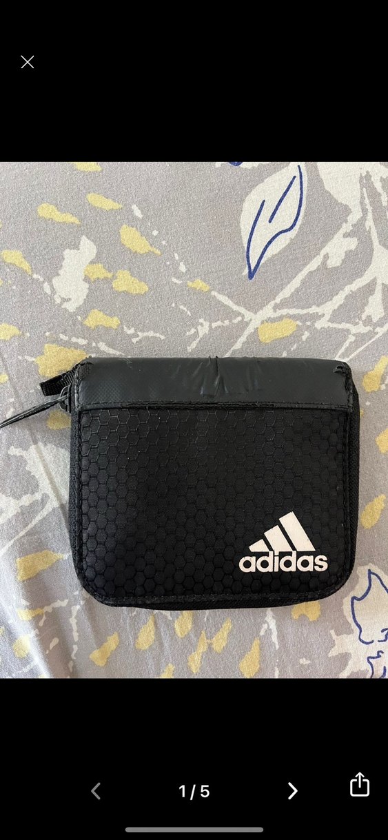 Adidas marka siyah çocuk cüzdanı, baskılı deseni ve fermuarlı kapanışıyla sokak modasına uygun ve kullanışlıdır. Soyulan kısımları fotoğrafta göründüğü gibi