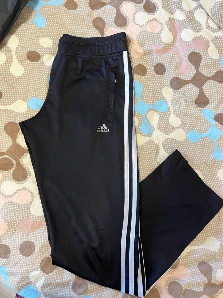 Adidas siyah kadın spor eşofman altı, sentetik kumaştan, bol kesim ve normal boyda. Beyaz yan çizgileri ve cırt cırt detaylarıyla spor tarzı sunar.