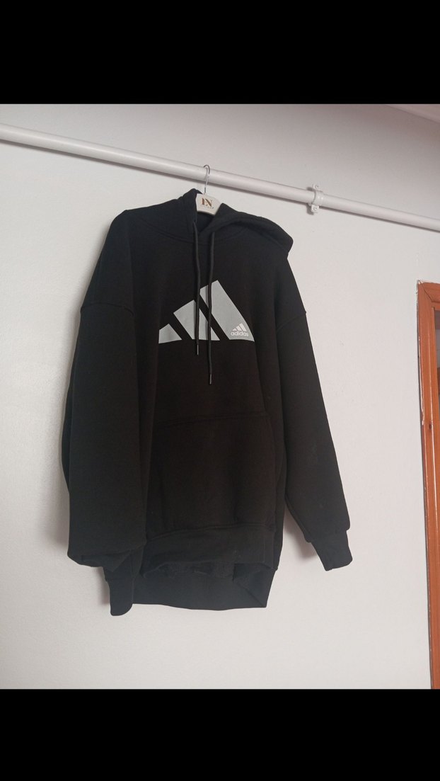 Adidas siyah kapüşonlu sweatshirt, oversize kesim ve uzun kollu. Yumuşak fleece kumaştan, sade ve logo detaylı, günlük rahat stil için uygun.