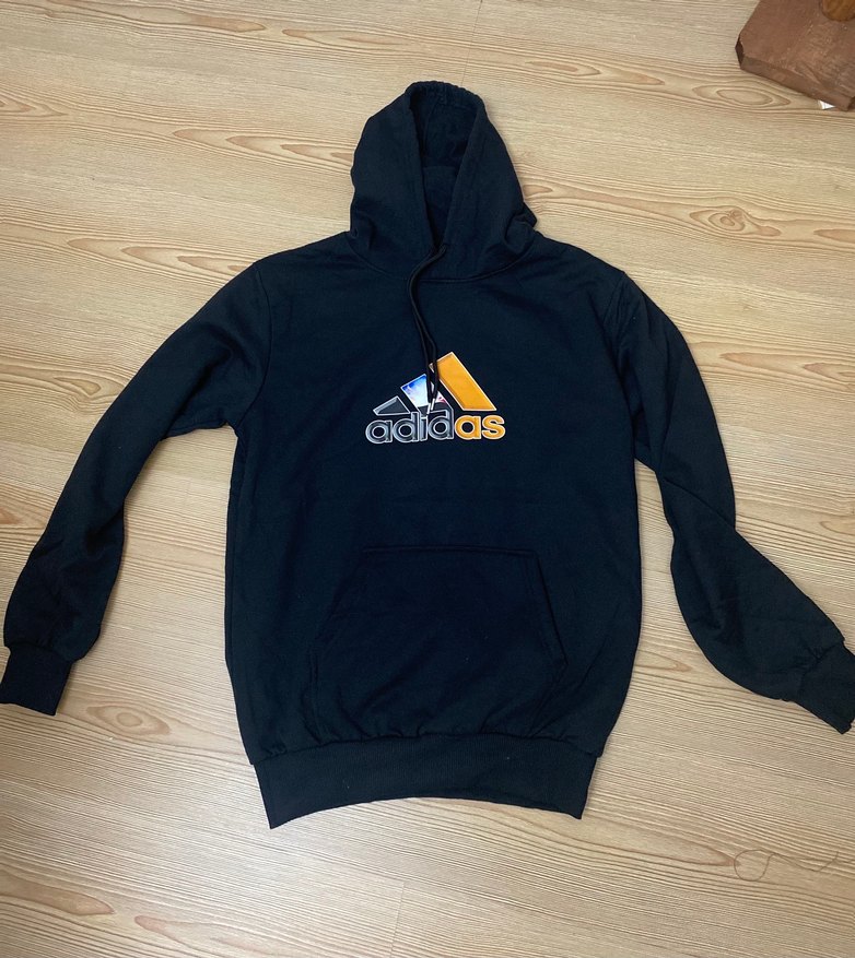 Siyah Adidas kapüşonlu sweatshirt, uzun kollu ve bol kesimdir. Yumuşak ve sıcak kumaştan üretilmiş, önde baskılı logo ve cırt cırt detayına sahiptir.