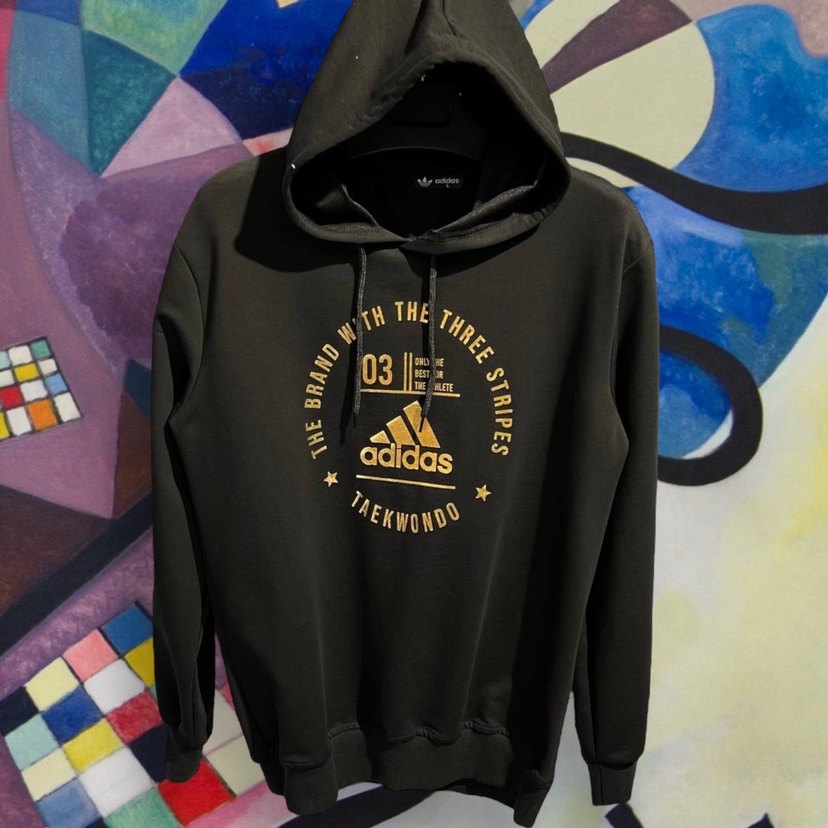 Siyah Adidas kapüşonlu sweatshirt, yumuşak ve sıcak kumaş, uzun kollu ve bol kesim. Baskılı logo ve cırt cırt detaylı, spor tarzı için uygundur.