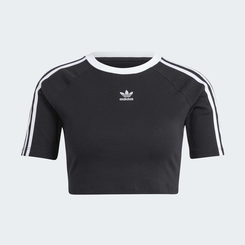 Adidas siyah crop top, kısa kollu ve bisiklet yaka detaylıdır. Sentetik kumaştan üretilmiş, baskılı logolu ve fit kesimlidir.