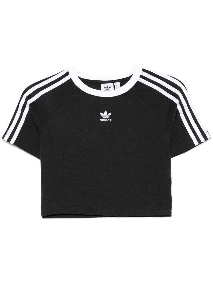 Siyah, kısa kollu ve beyaz şerit detaylı bu crop top, dar kesimi ve yuvarlak yakasıyla spor ve sokak stilini birleştirir. Sentetik kumaştan üretilmiştir.