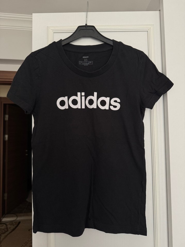 adidas baskılı, kısa kollu, pamuklu, siyah, normal uzunlukta, dar kesim tişört. Günlük kullanıma uygun rahat bir parça.