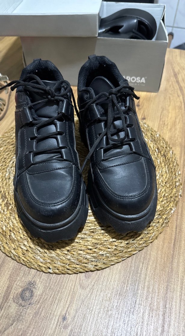 Siyah platform tabanlı, bağcıklı spor ayakkabı. Kauçuk malzemeden üretilmiş, günlük kullanıma uygun. OSA marka.
