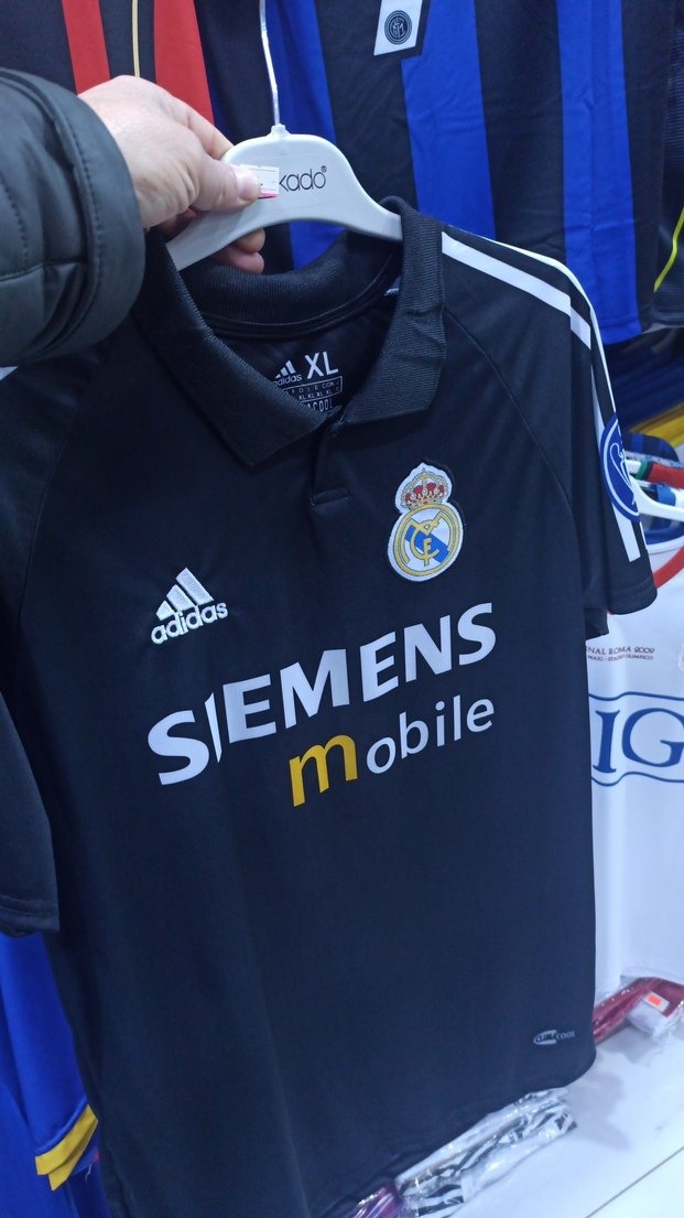 Koyu siyah Adidas Real Madrid forması, kısa kollu ve bisiklet yaka. Siemens Mobile baskılı, yapışkan detaylı, sportif sokak stili için uygun. ⚽