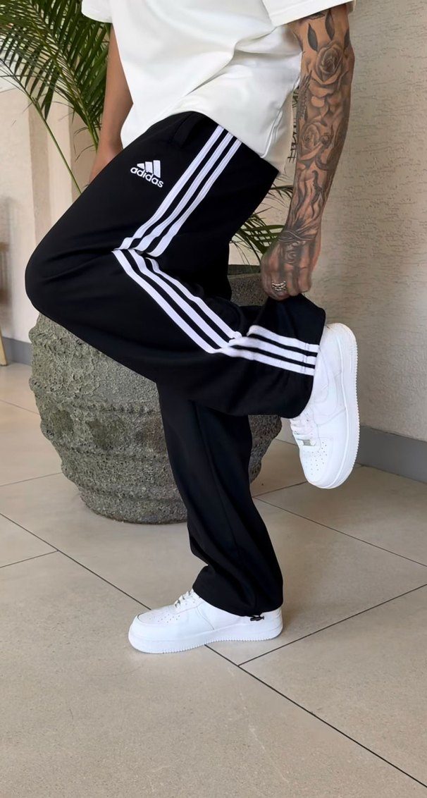 Adidas siyah, beyaz şeritli, bağcıklı beliyle rahat kesim eşofman altı. Spor ve günlük kullanım için uygun, yumuşak kauçuk benzeri kumaş.