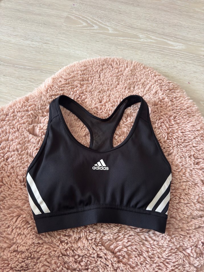 Adidas siyah sporcu sütyeni, yanlarda beyaz baskılı çizgiler ve sırt kısmında racerback tasarım ile rahatlık sağlar. xs beden uyumlu