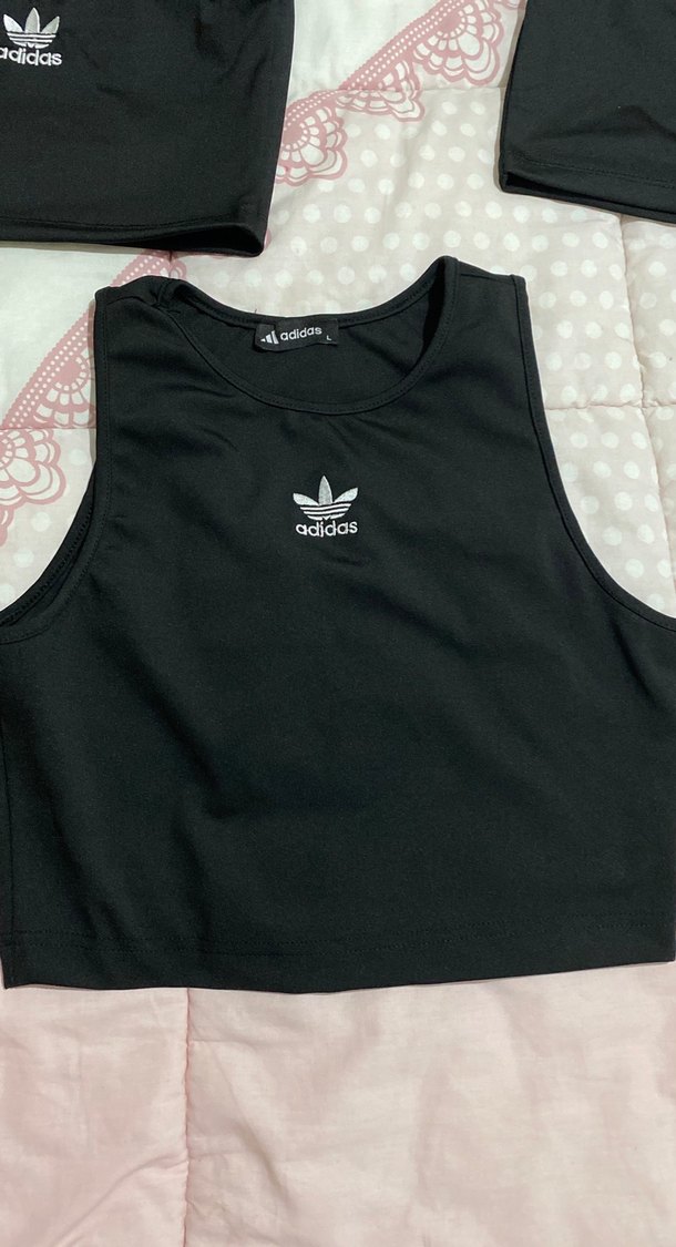 adidas markalı siyah, kolsuz ve straplez, sentetik kumaştan yapılmış, sportif ve sokak stili için uygun, vücuda oturan crop top.