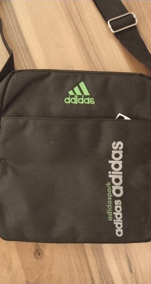 Siyah Adidas omuz çantası, baskılı logolar ve velcro kapama özelliğiyle dikkat çeker. Streetwear ve athleisure tarzına uygundur.