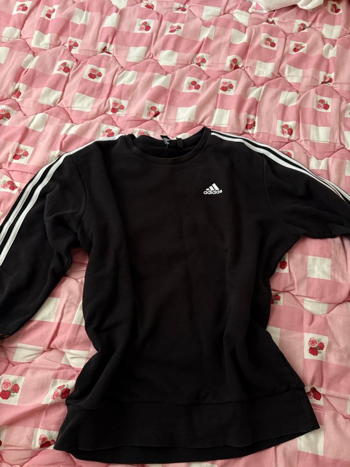 Adidas kız sweatshirtü, uzun kollu ve yuvarlak yakalıdır. Pamuktan üretilmiş, rahat ve bol kesimdir. Koyu siyah rengi ve kollarındaki beyaz çizgilerle sade, şık bir sokak stili sunar. sol kolunda küçük bir leke izi var, onun haricinde yeni gibi.