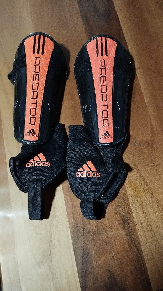 Siyah turuncu baskılı dizlik, kauçuk malzeme ve cırt cırtlı kapanışa sahip. Üzerinde PREOATOQA yazısı ve Adidas logosu bulunur. ️