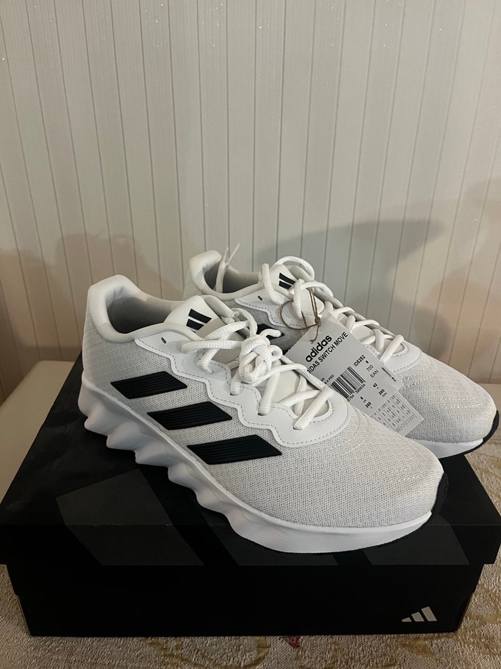 Siyah çizgili beyaz Adidas erkek spor ayakkabısı, bağcıklı ve stiletto tarzı tabanlı, sportif sokak giyimi için uygun.