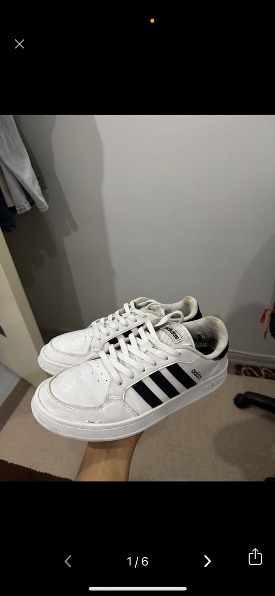 Siyah çizgili beyaz spor ayakkabı, düz kauçuk taban ve bağcıklı tasarıma sahiptir. Spor ve sokak stili için uygundur.
