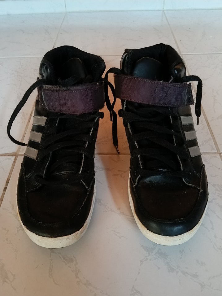Adidas marka siyah rwnk kenarları kahverengi çizgili cırtlı ve ipli cırtları mürdüm rengi bilekli sağ iç arkada küçük bir yırtık vardır kenarlarında açılma veya yırtık yoktur 44.5 numara spor ayakkabı