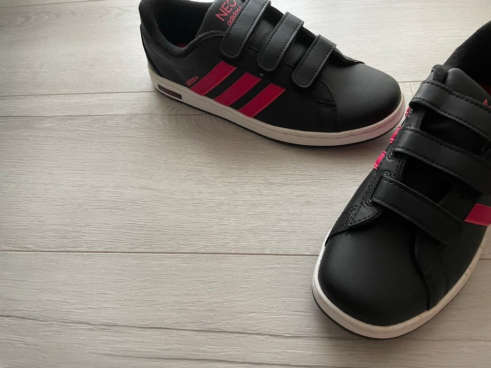 Koyu renkli, pembe çizgili detaylara sahip, cırt cırtlı ve kauçuk tabanlı spor ayakkabısı.