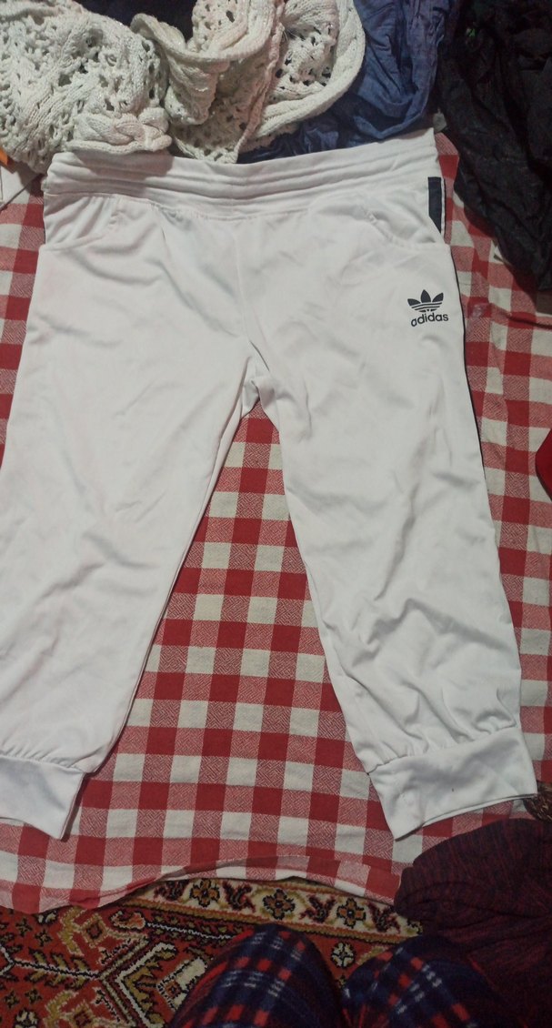 unisex beyaz Adidas eşofman, elastik bel ve manşetlere sahip, pürüzsüz sentetik kumaştan üretilmiştir, spor ve gündelik sokak stili için uygundur.