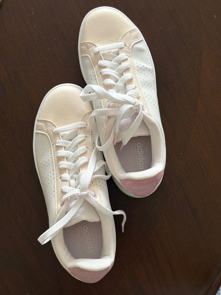 Beyaz bağcıklı kadın spor ayakkabısı, lastik tabanlı, günlük rahat kullanım için arkası pembe süet, burnu pastel renk detaylı. Bana hediye gelmişti, numaram olmadığı için giyemedim.