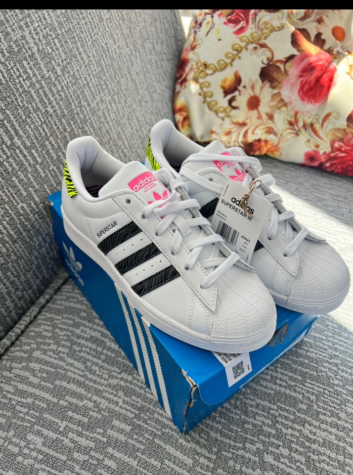 Beyaz Adidas Superstar spor ayakkabı, siyah çizgiler, cırt cırt detay ve yüksek topuklu kauçuk taban ile gri baskılı şık tasarım.
